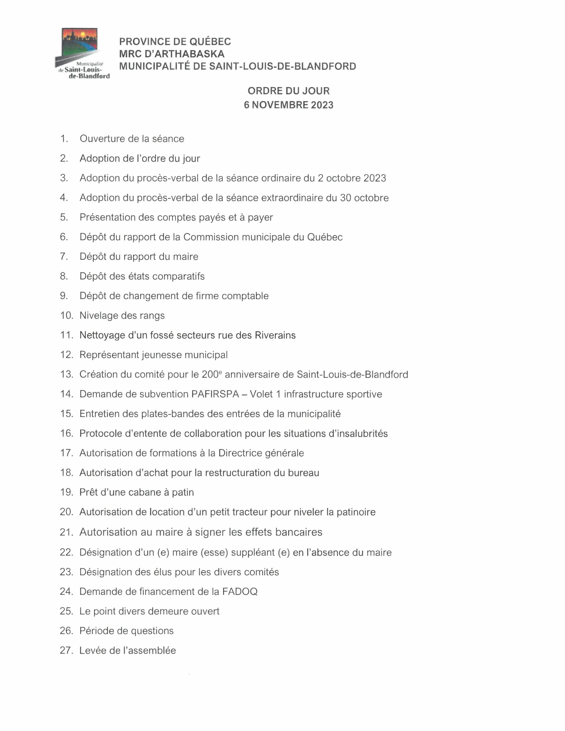Ordre du jour séance du 6 novembre 2023 AccueilNouvellesArticles récentsConseils municipauxOrdre du jour séance du 6 novembre 2023 Publié le 6 novembre 2023 Articles récents, Conseils municipaux Navigation de l'article Previous Previous post: AVIS DE SCRUTINNext Next post: Ordre du Jour Séance du 6 novembre 2023